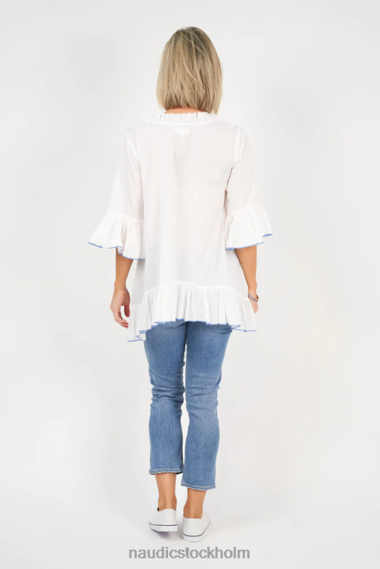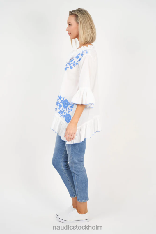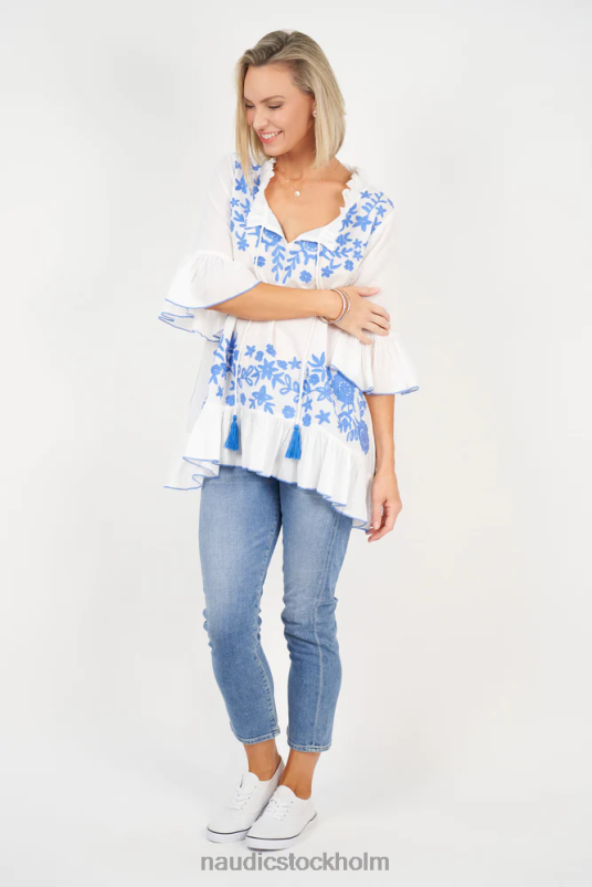 fira påsk med stil med denna vackra hacienda-tunika med härlig färg och utsökta detaljer som är helt naudiska! Denna tunika visar upp det delikata broderiet av vårt nya azalea-emb-tryck och är en luftig stil med en ärm som erbjuder lite extra täckning under de kallare månaderna. läckra tofsar och den feminina, volangfållen lägger till den där extra utstrålningen som tar dig från dag till natt på ett ögonblick.
