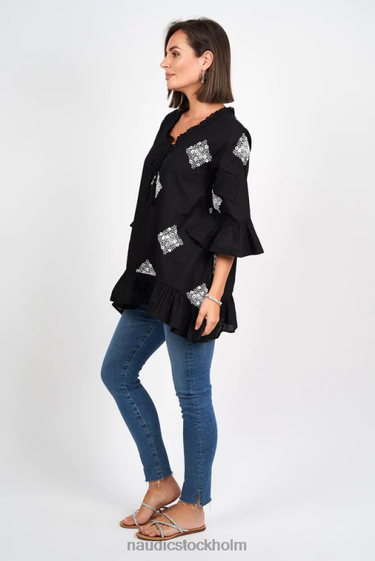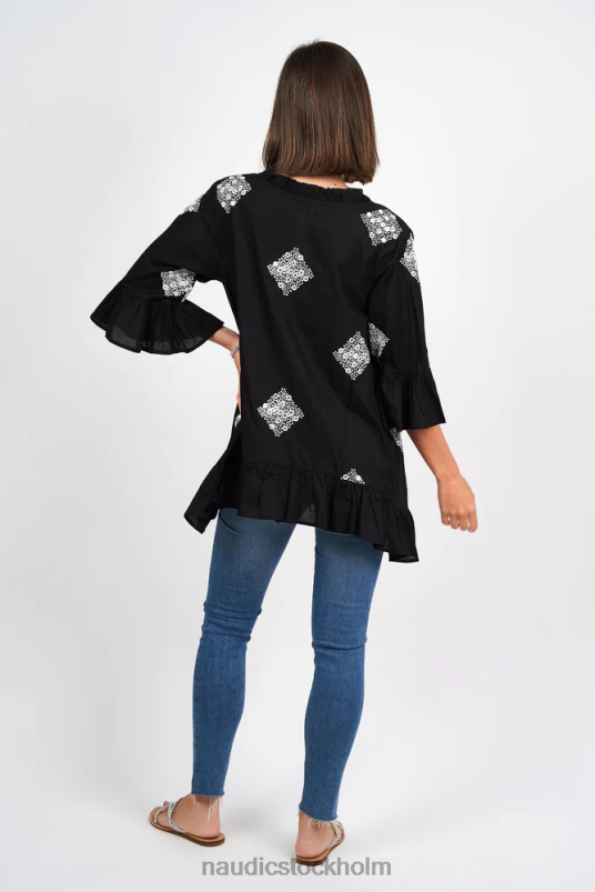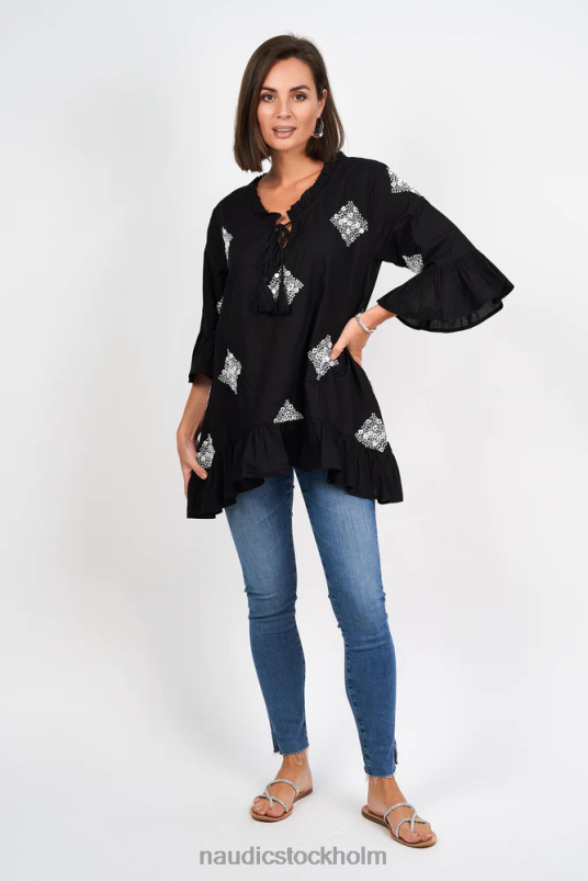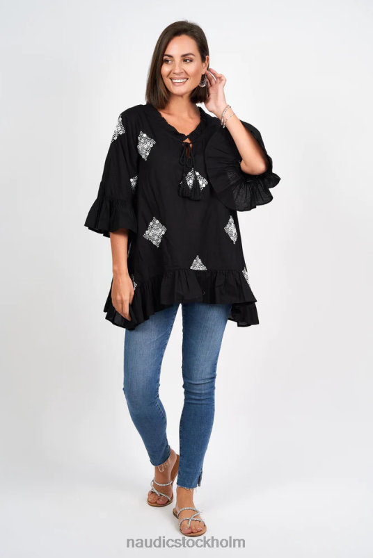 denna eleganta hacienda-tunika är en del av vår utsökta vintagekollektion och visar upp vårt fantastiska diamant-schiffli-tryck. denna snygga tunika har delikat broderade diamantmotiv med spegeldetaljer som garanterat hjälper dig att sticka ut i mängden! en avslappnad stil med en ärm som ger lite extra täckning under de kallare månaderna. Vackra tofsar och den feminina, volangfållen lägger till den där extra utstrålningen som tar dig från dag till natt på ett ögonblick.