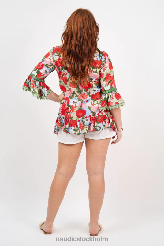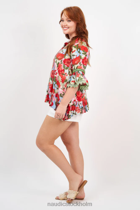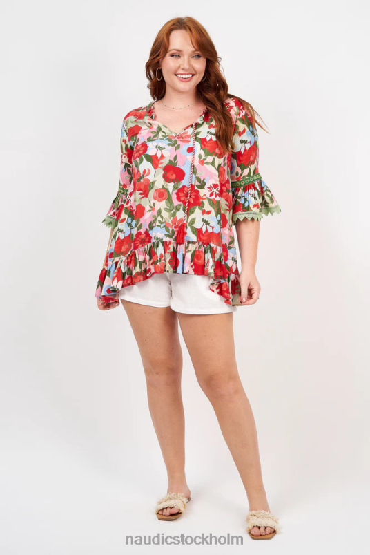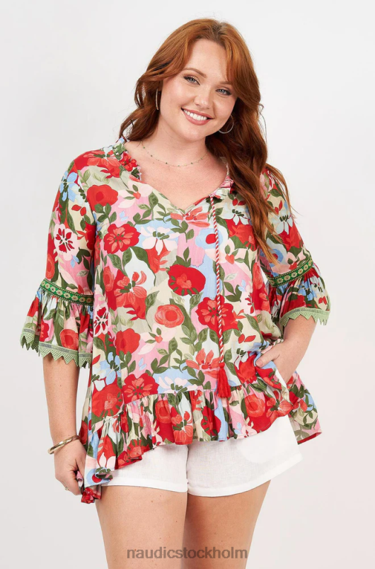 älskare av djärva och vackra färger kommer att älska vårt nya dorest-tryck som visas upp i denna underbara hacienda-tunika. denna klassiska avslappnade naudiska stil har volang, 3/4-ärmar och feminin volangkant. vackra tofsar och ömtåliga gobelänger och spetsdetaljer ger denna tunika den extra utstrålningen som kan ta dig från dag till natt på ett ögonblick.
