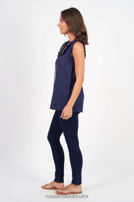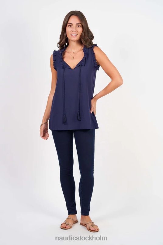 Sophia-toppen är en del av vårt naudic essentials-sortiment och kommer säkerligen att bli en favoritdel av din vardagsgarderob. med sina ärmlösa, råa volang och dekorativa tofsar är sophia perfekt att kombinera med din favoritkjol eller byxor.