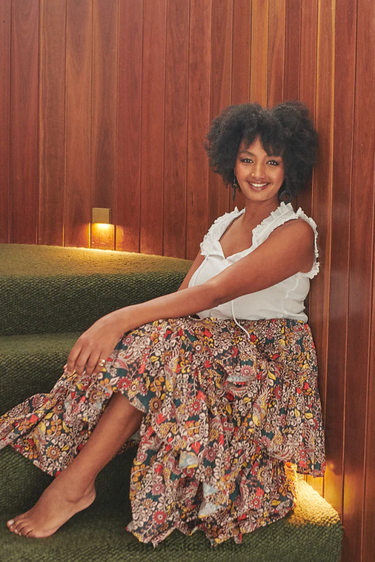 vår utsökta sangria-kjol visar upp den sublima blandningen av orientaliska blommor och rika juveltoner i vårt nya beatrix-tryck. den här vackra kjolen har en bred, elastisk midja och 3 gudomliga lager volanger som säkerställer en bekväm men ändå feminin look. kan också bäras under armarna som den sötaste axelbandslösa mini om du letar efter en rolig, alternativ look!