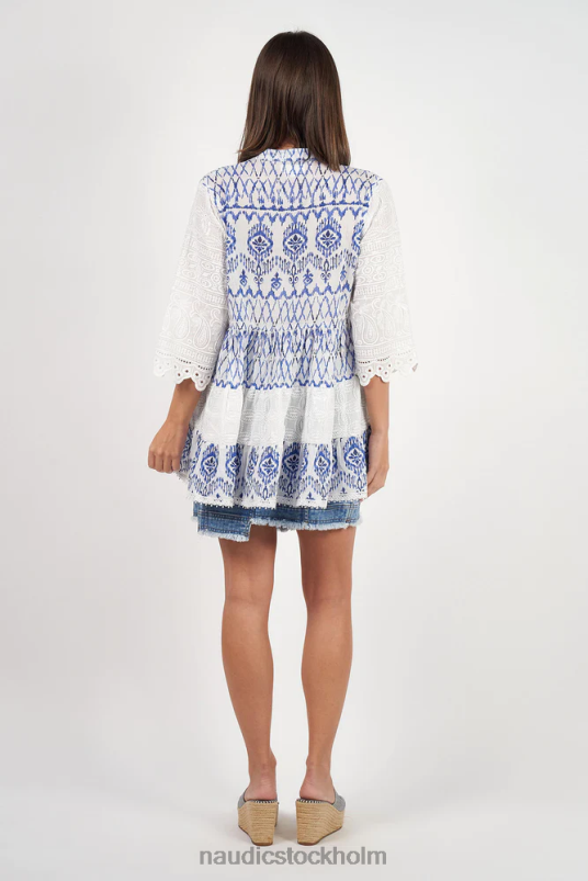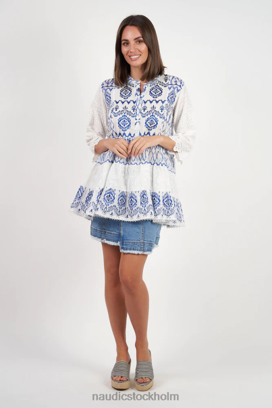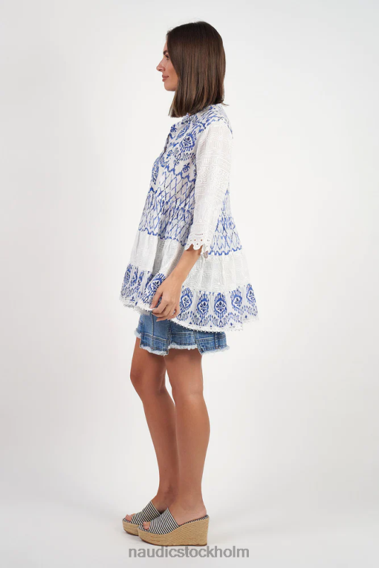 denna fantastiska cypernöverdel i vår viva broderie patch förkroppsligar allt som är traditionellt naudiskt...härlig färg, utsökt broderi och klassisk elegans! bli kär i det intrikata vita nålarbetet och paljettdetaljerna i kombination med rika blå ikat-mönster. med blått tyg på livstycket förstärker denna underbara topp ytterligare. härliga broderi angliasedetaljer på ärmarna och ömtåliga spetskanter på den skiktade kroppen ger lite extra charm!