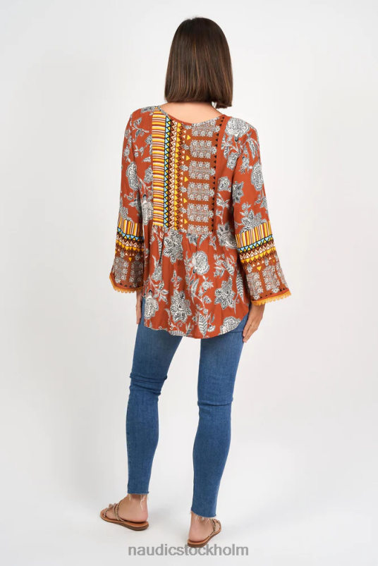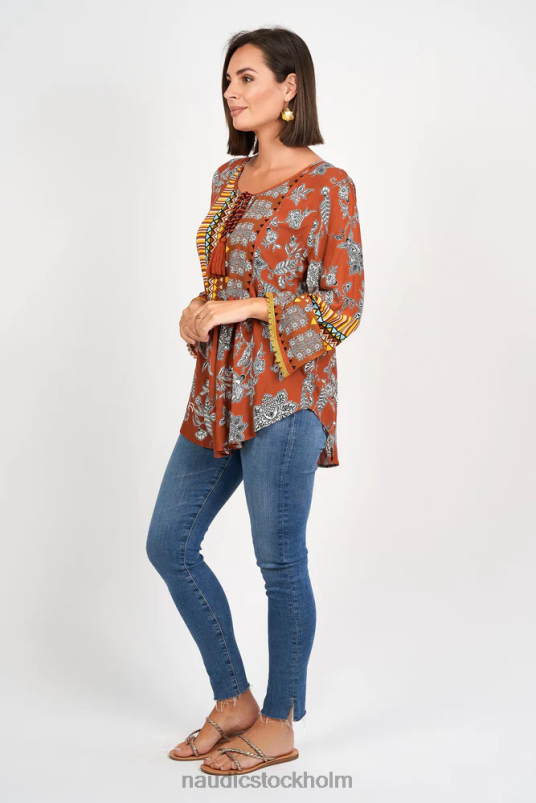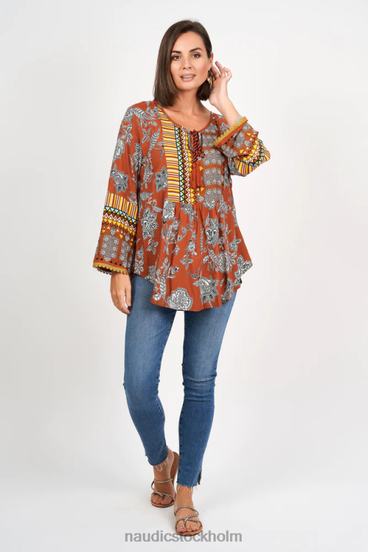 denna slående cypriati-topp har de varma vintertonerna, intrikata blommor och geometriska mönster i vårt nya astertryck. de något längre 3/4-ärmarna trimmade med ömtålig senapsspets ger lite extra täckning när de går in i de kallare månaderna. den här ursnygga toppen är ett perfekt val för en avslappnad träff med vänner.