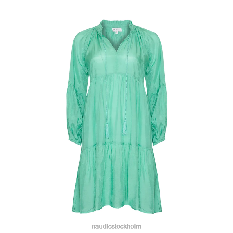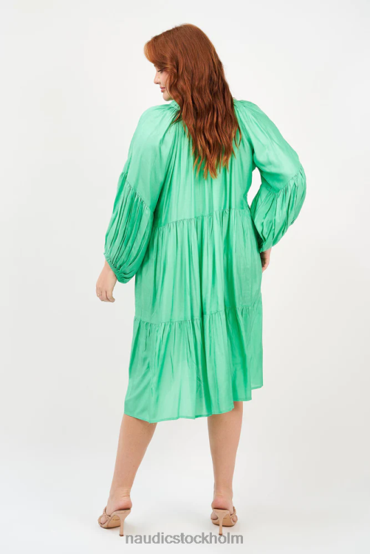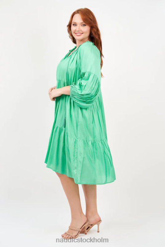 vår mollyklänning är en stil som kan bäras året runt. fallskärmsärmar med manschett ger mångsidighet under säsong medan den volangiga v-ringningen ger en feminin touch.