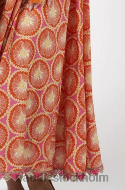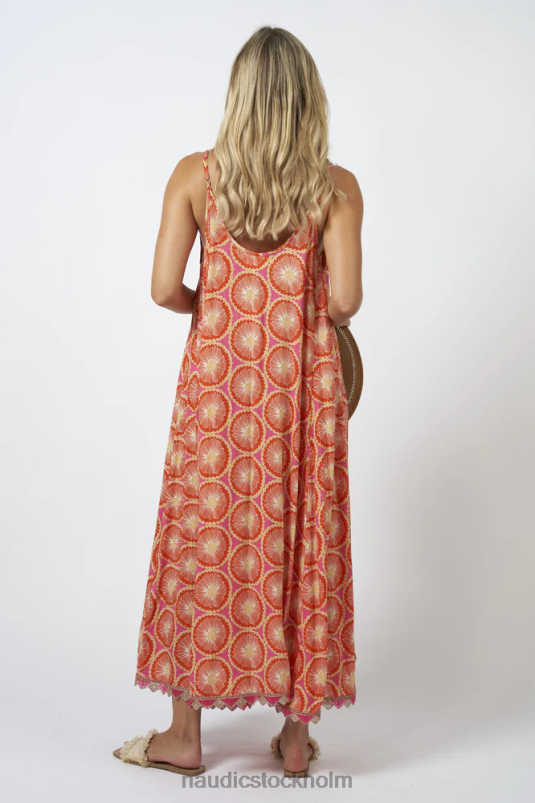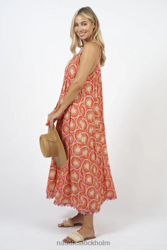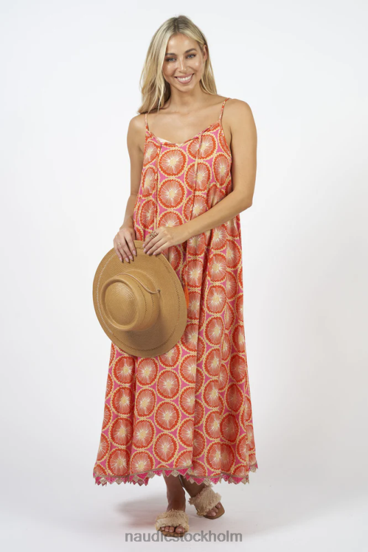 denna fantastiska astrid maxi visar upp vårt ljusa och somriga aranciatryck. den har skosnören och en hel kjol med utsökt, ljust rosa och guldbroderade detaljer som garanterat kommer att glädjas. justerbara remmar ger en perfekt passform som säkerställer att du känner dig sval och bekväm en varm sommardag.