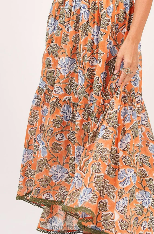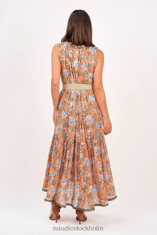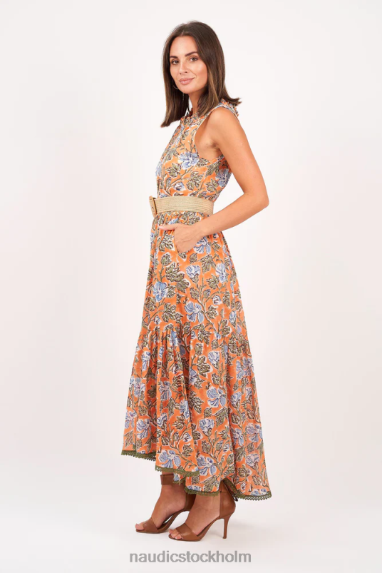 Känn dig fri och flytande i denna underbara nya mabel maxi med de milda blå och olivfärgade blommorna och kontrasterande mandarin i vårt montanatryck. den här klänningen har en flytande, asymmetrisk nederkant och mjuk feminin volang runt halsen. ömtåliga olivkanter på hela kjolen ger lite extra romantik vilket gör denna mabel till det perfekta valet för lunch med tjejer. Observera att klänningen inte är fodrad - vi rekommenderar starkt att den bärs med hel slip eller halv slip.